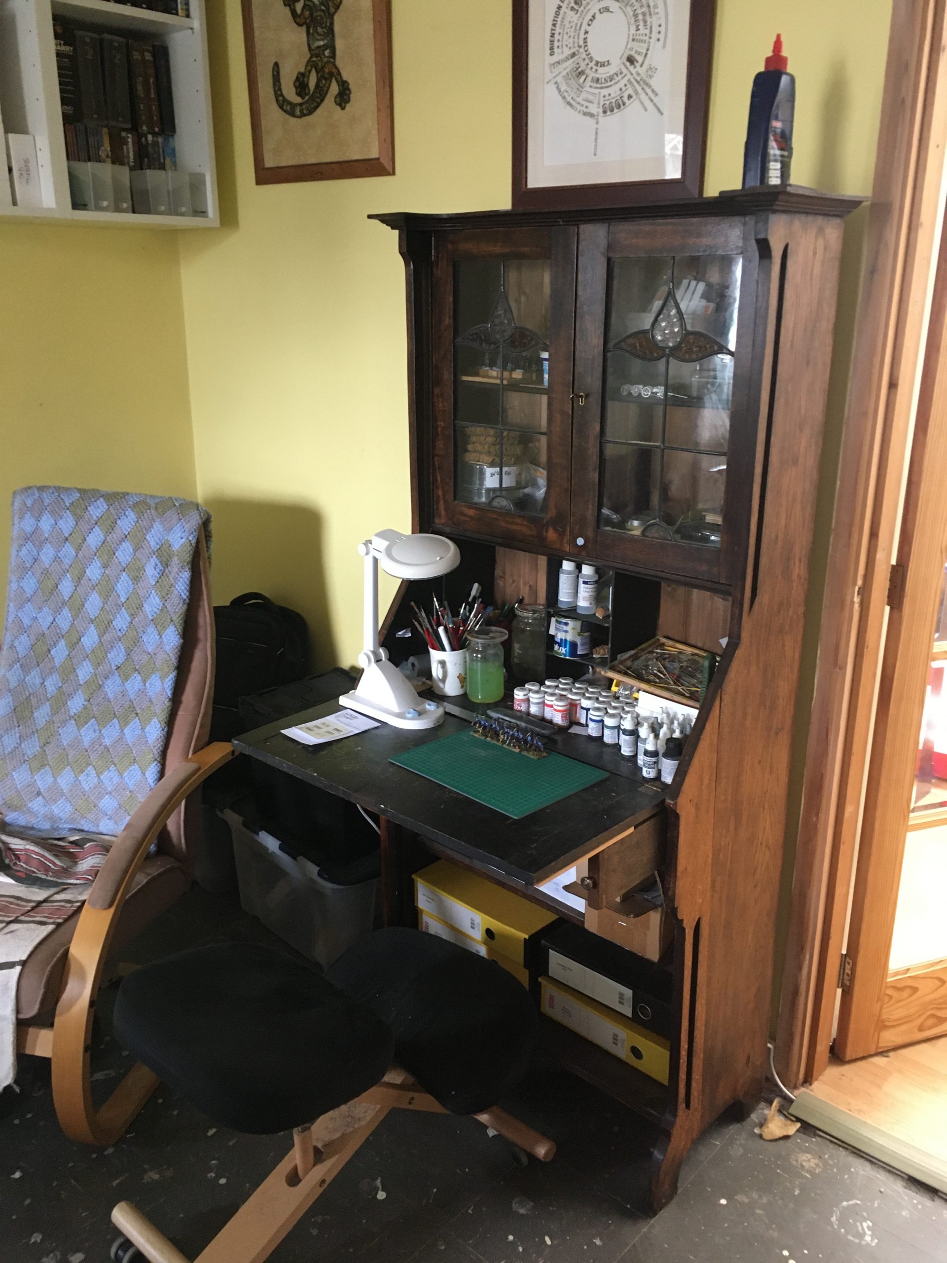 As the conservatory remains quite chilly, and starting to suffer from cabin fever, decided to move the painting bureau into the warmth.