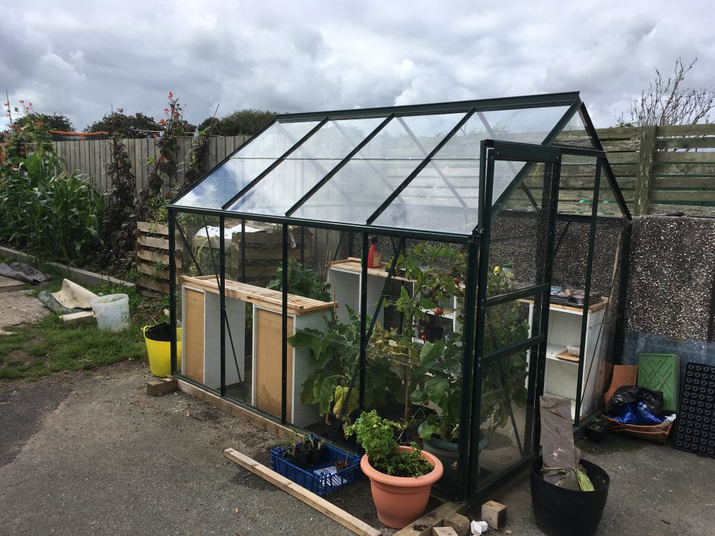 Thanks to some few toughened glass panels from Cornwall Glass in St Austell the greenhouse now has a roof again.