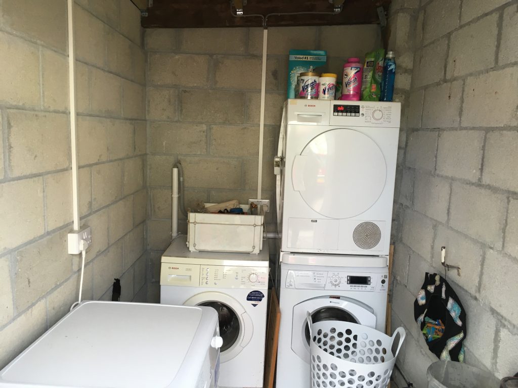 The utility area now houses 2 tumble dryers and 2 washing machines. Until we get a another “strap em together” kit they saying on the floor. A freezer is pending.