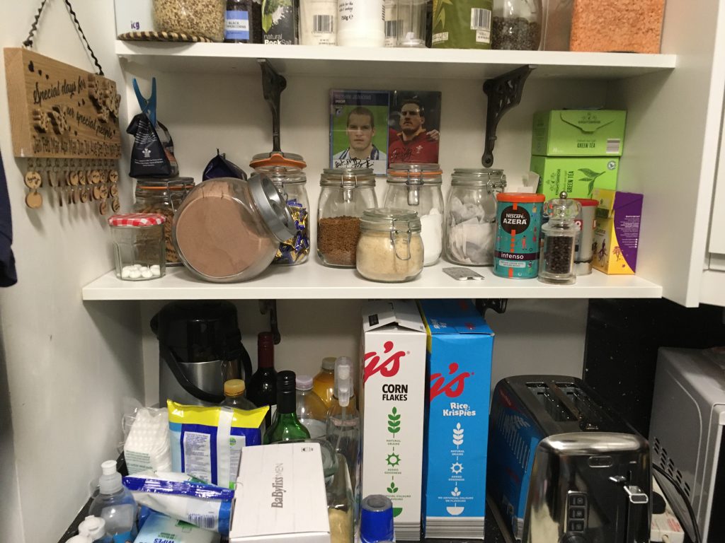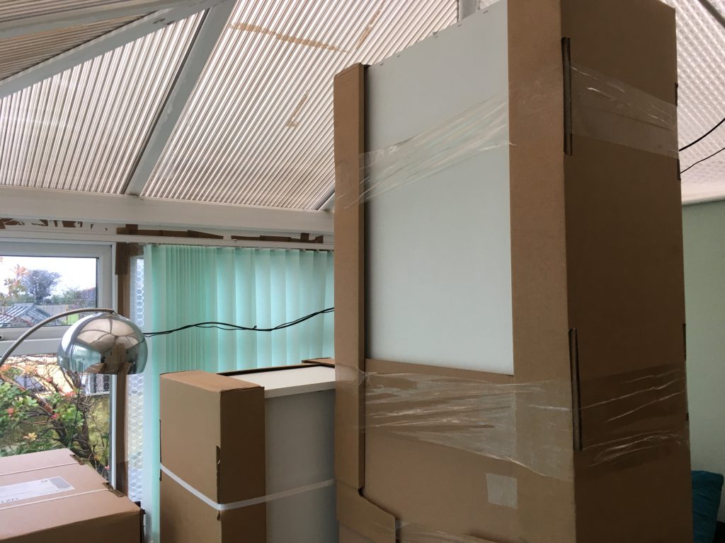 The wall of kitchen units have arrived. In the Conservatory for now.