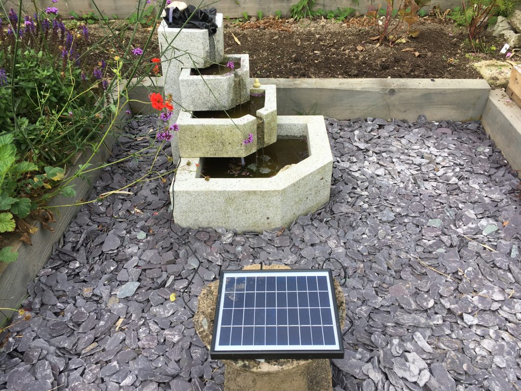 Water feature gets solar upgrade – note to self – check wattage before purchase!